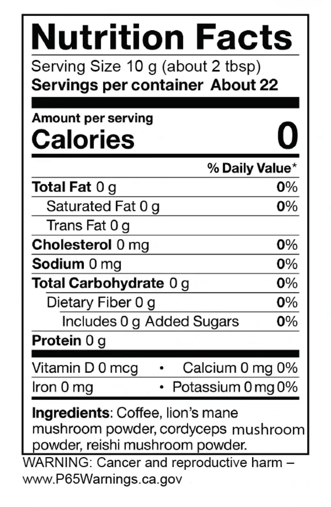 Ingredients: Coffee, Lion’s Mane Mushroom Powder, Cordyceps Mushroom, Powder, Reishi Mushroom Powder
